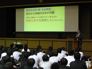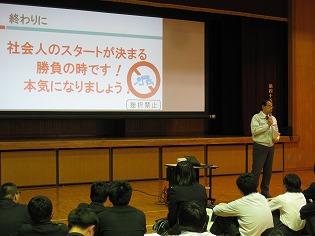 就職に向けての心構え、企業選択から選考試験までの手順説明と履歴書・選考試験対策について説明が行われました。
