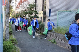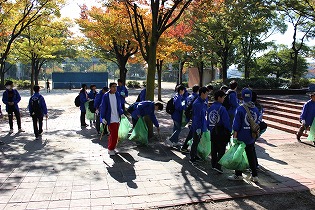 秋晴れの中、校舎周辺を清掃しながら、神宮東公園に集合しました。