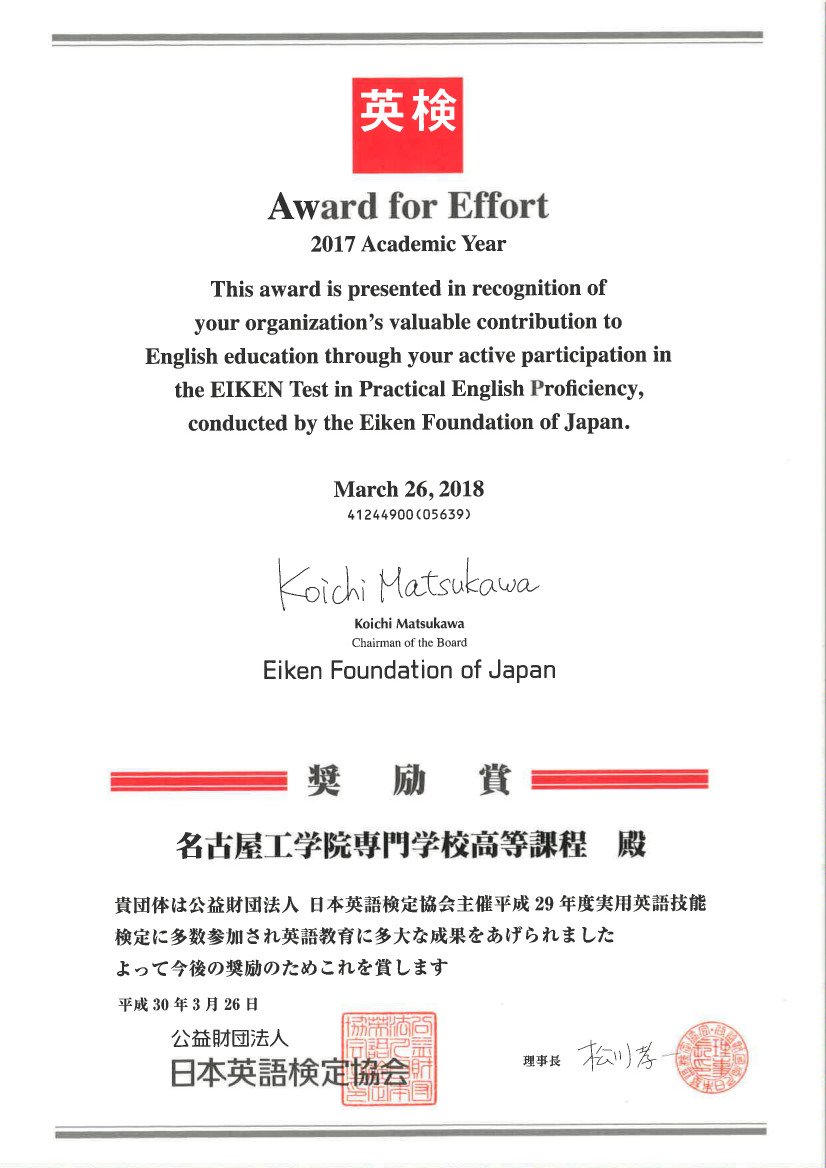 平成29年度、1級が1名、準1級が1名、2級が2名、準2級が2名、3級が13名、4級が20名、5級が16名の合格者をを出し、日本英語検定協会から『奨励賞』をいただきました。